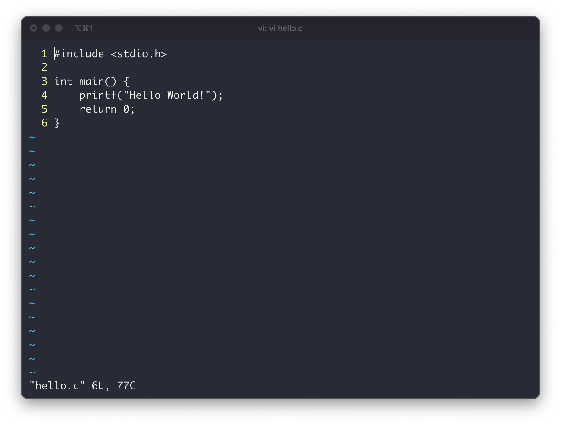 vi 에디터로 hello.c를 작성해보았다. 개발 입문은 역시 Hello World 로 여러가지 이유가 있는데, 가장 큰 이유는 커서가 있는곳에 단순히 타자를 입력한다고 글자가 입력되지 않는다(..!)