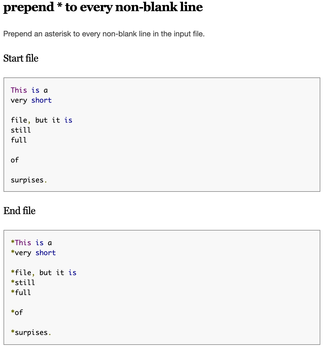 위의 문서를 아래와 같이 만들자. 몇 타수만에 가능하겠는가? 빈 줄이 아닌 줄 맨 앞에 * 를 삽입하는 간단한 문제이다.